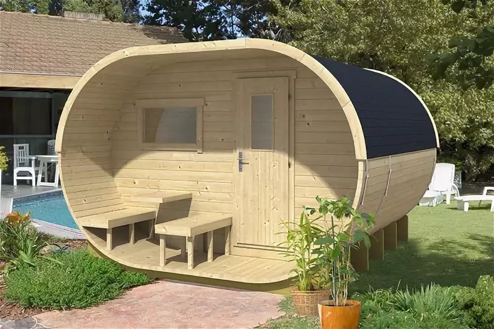 Баня-бочка овальная из кедра 4 метра Овальная баня-бочка из кедра просторная и вместительная. Имеет два отделения: раздевалку, которую можно использовать как комнату отдыха, и парилку. Для удобства пользования раздевалка оснащена лавочкой, полкой и вешалкой из кедра. В парильном отделении располагается печь и двухуровневый открытый полок. Для установки такой модели не требуется полноценный фундамент, поэтому при необходимости ее можно перенести на другое место. Так же баню-бочку можно укомплектовать верандой со скамейками, козырьком и печью с внешней загрузкой, благодаря которой весь мусор после топки останется на улице. Древесина кедра насыщена эфирными маслами и фитонцидами, которые активируются при воздействии температур. Таким образом, парение в каркаско-щитовых банях из кедра вдвойне полезно.