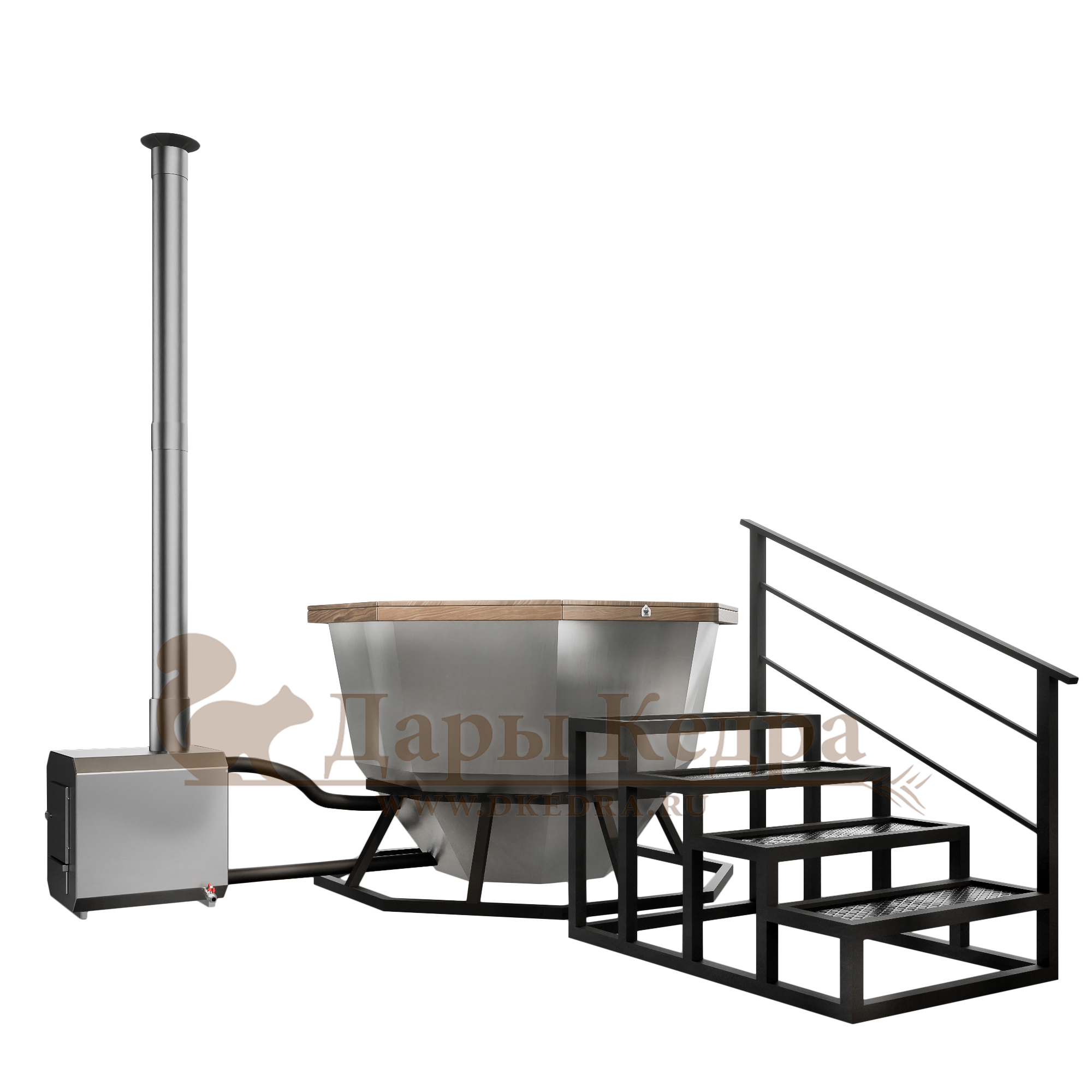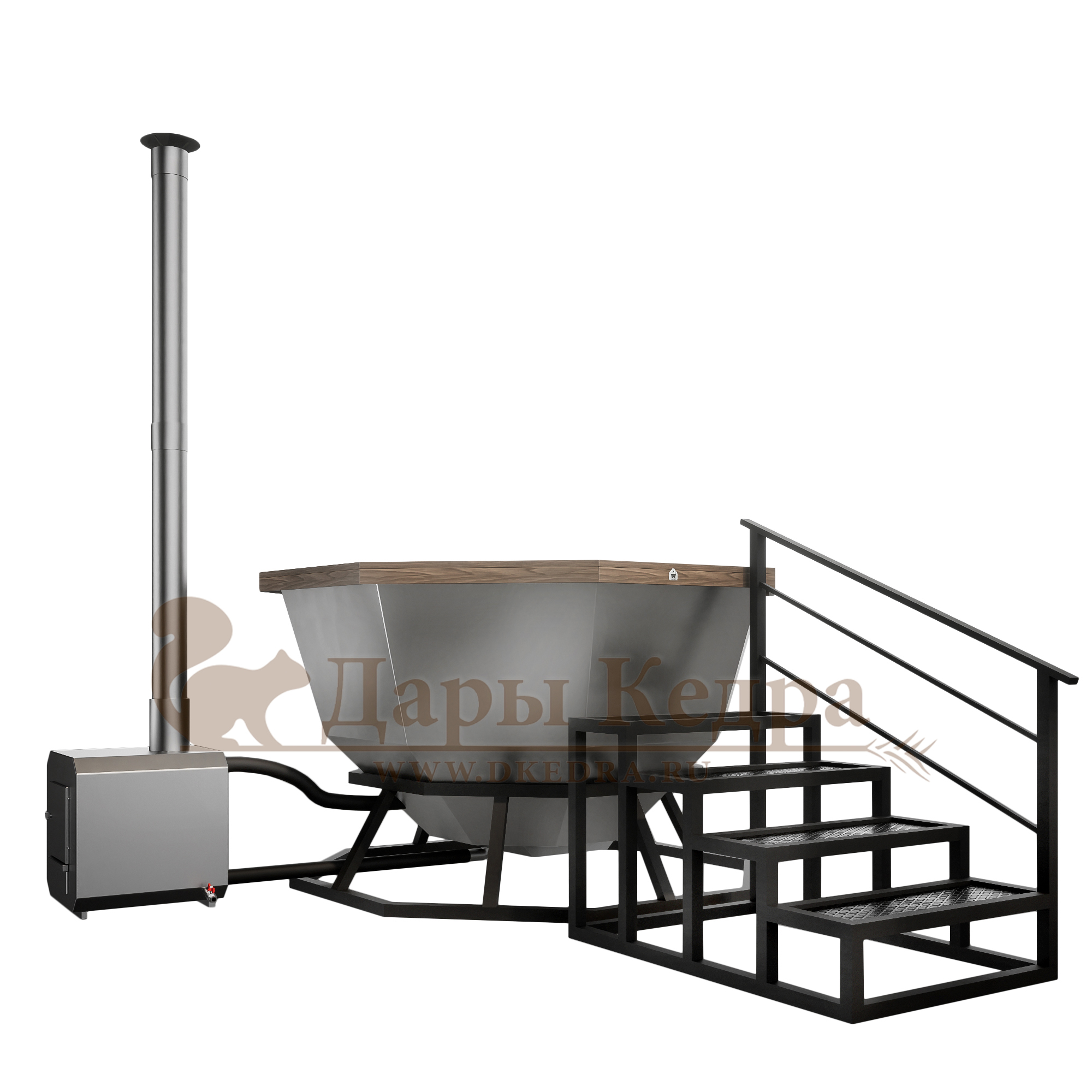 Конструкция устанавливается на прочную подставку, обеспечивающую устойчивость. Для удобства предусмотрена лестница, ведущая внутрь чана. Внутри оборудованы удобные сиденья, позволяющие комфортно расположиться. В зависимости от модели, вместимость составляет от 5 до 10 человек — отличный вариант для семьи или компании.
