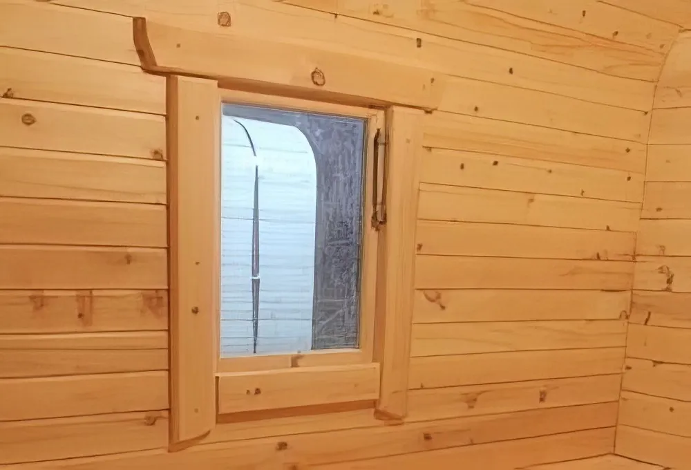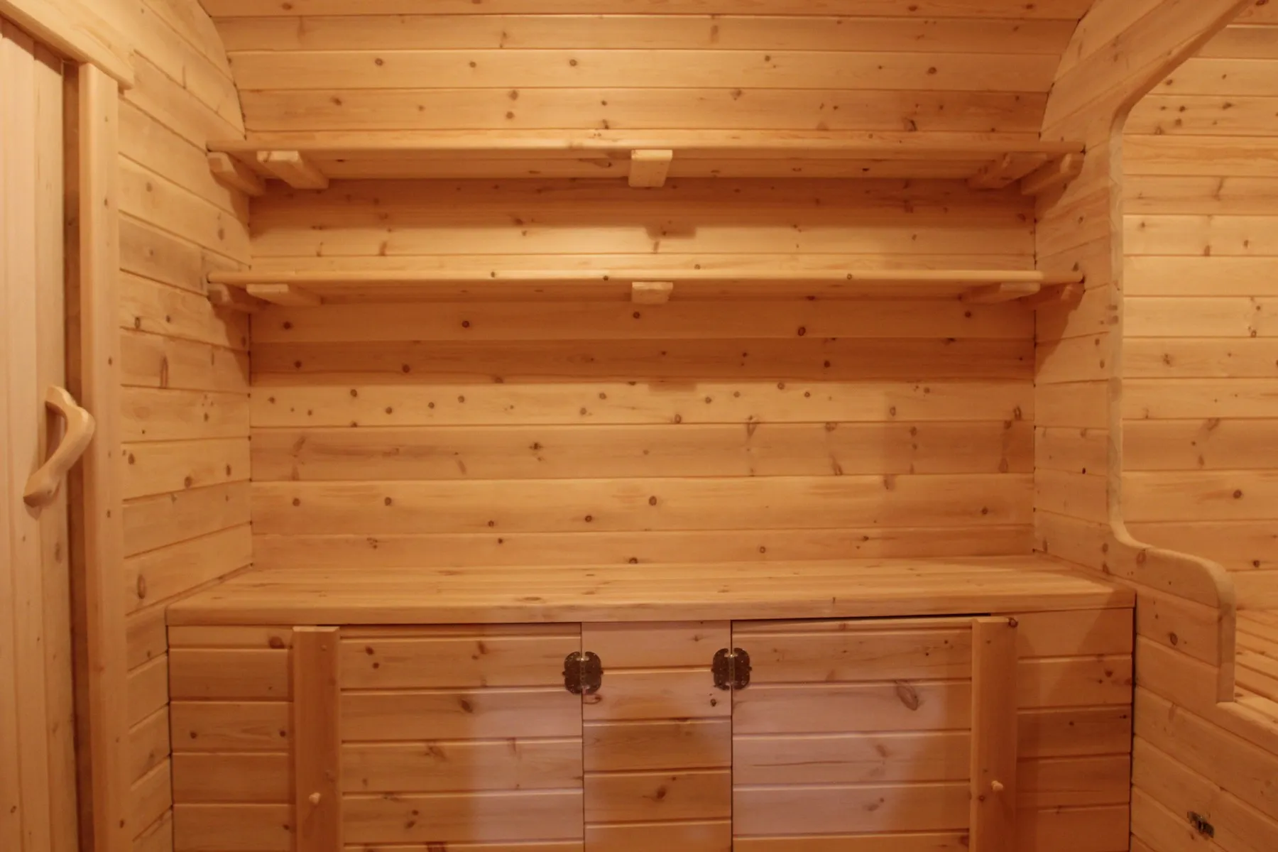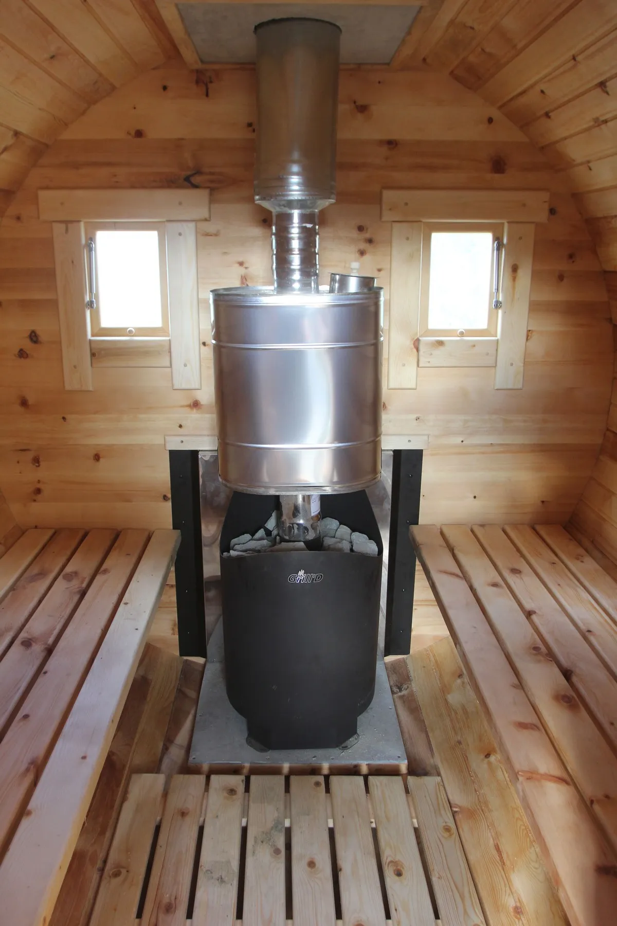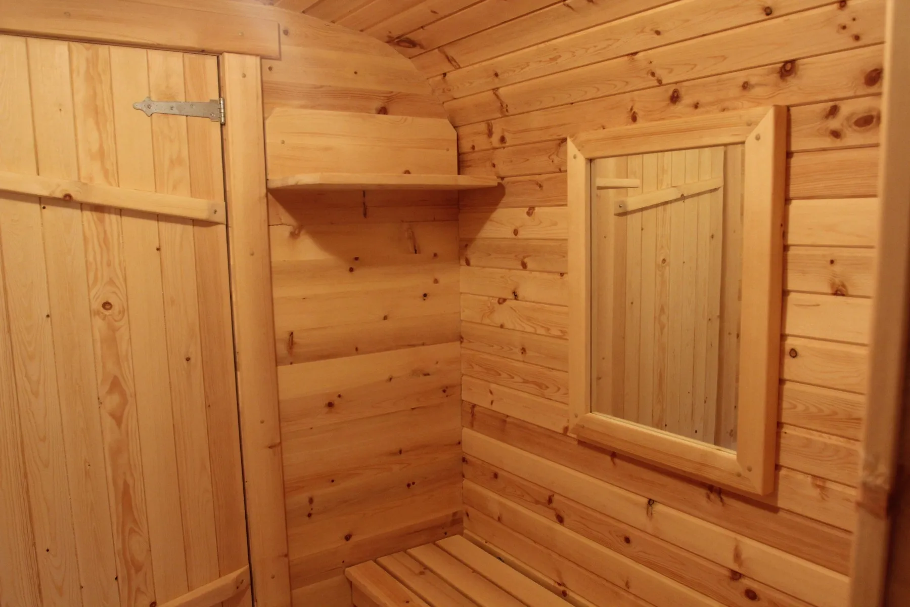 Это изделие круглой вытянутой формы с тремя отделениями: раздевалкой, моечной и парной. Во всех трех отделениях с обеих сторон установлены лавочки из кедра. Печь находится в парилке около дальней стены. Для удобства пользования в бане висят полочки из кедра и вешалка в раздевалке. Время растопки такой бани не превышает 30 минут. По вашему желанию баню-бочку можно дополнить печью с внешней загрузкой, благодаря которой весь мусор после топки останется на улице. Круглая баня-бочка не требует полноценный фундамент, поэтому при необходимости ее можно перенести в другое место.