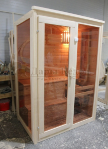 Это специально оборудованная готовая деревянная кабина для сухого и влажного парения. Электропечь нагревает пространство внутри и позволяет сбрызгивать камни водой, слегка увлажняя воздух. Такая процедура позволяет избежать перегрева. Сауна обшита снаружи и внутри вагонкой из липы и имеет теплоизоляционный слой. Финская сауна с электропечью подойдет, как для домашнего использования, так и для коммерции. Доставляется в разборном виде щитами, собирается по инструкции с помощью шуруповёрта.
