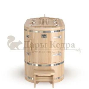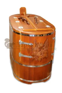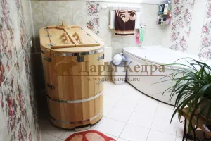 Кедровая фитобочка полулежачая - это мини парная, которую можно использовать не только в спа-салонах, но и дома. Модель этой бочки наиболее комфортна, так как позволяет принимать процедуры полулежа. Толщина стенок составляет 25 мм. Фитобочка оборудована откидными створками, дверцей и отверстием для головы. Во время парения человек находится внутри кедровой бочки, а голова снаружи. Благодаря этому исключается возможность перегрева. Подлокотники, подспинник из кедра и внутренние ручки делают эксплуатацию фитобочки более удобной.